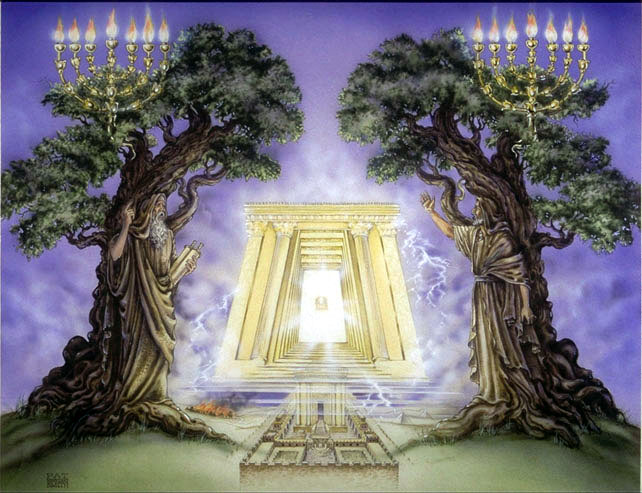 Revelation 11:1-19 "And there was given me a reed like unto a rod: and the angel stood, saying, Rise, and measure the temple of God, and the altar, and them that worship therein. But the court which is without the temple leave out, and measure it not; for it is given unto the Gentiles: and the holy city shall they tread under foot forty and two months. And I will give power unto my two witnesses, and they shall prophesy a thousand two hundred and threescore days, clothed in sackcloth. These are the two olive trees, and the two candlesticks standing before the God of the earth. And if any man will hurt them, fire proceedeth out of their mouth, and devoureth their enemies: and if any man will hurt them, he must in this manner be killed. These have power to shut heaven, that it rain not in the days of their prophecy: and have power over waters to turn them to blood, and to smite the earth with all plagues, as often as they will. And when they shall have finished their testimony, the beast that ascendeth out of the bottomless pit shall make war against them, and shall overcome them, and kill them. And their dead bodies shall lie in the street of the great city, which spiritually is called Sodom and Egypt, where also our Lord was crucified. And they of the people and kindreds and tongues and nations shall see their dead bodies three days and an half, and shall not suffer their dead bodies to be put in graves. And they that dwell upon the earth shall rejoice over them, and make merry, and shall send gifts one to another; because these two prophets tormented them that dwelt on the earth. And after three days and an half the Spirit of life from God entered into them, and they stood upon their feet; and great fear fell upon them which saw them. And they heard a great voice from heaven saying unto them, Come up hither. And they ascended up to heaven in a cloud; and their enemies beheld them. And the same hour was there a great earthquake, and the tenth part of the city fell, and in the earthquake were slain of men seven thousand: and the remnant were affrighted, and gave glory to the God of heaven. The second woe is past; and, behold, the third woe cometh quickly. And the seventh angel sounded; and there were great voices in heaven, saying, The kingdoms of this world are become the kingdoms of our Lord, and of his Christ; and he shall reign for ever and ever. And the four and twenty elders, which sat before God on their seats, fell upon their faces, and worshipped God, Saying, We give thee thanks, O Lord God Almighty, which art, and wast, and art to come; because thou hast taken to thee thy great power, and hast reigned. And the nations were angry, and thy wrath is come, and the time of the dead, that they should be judged, and that thou shouldest give reward unto thy servants the prophets, and to the saints, and them that fear thy name, small and great; and shouldest destroy them which destroy the earth. And the temple of God was opened in heaven, and there was seen in his temple the ark of his testament: and there were lightnings, and voices, and thunderings, and an earthquake, and great hail." (Source: AMG Hebrew Greek Key Study Bible, KJV - bold letters added by editor)
