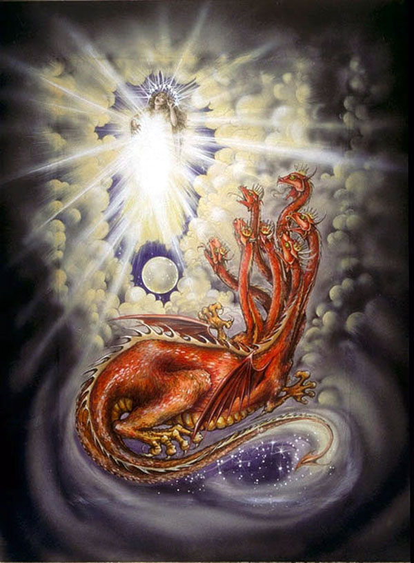 Revelation 12:1-17 "And there appeared a great wonder in heaven; a woman clothed with the sun, and the moon under her feet, and upon her head a crown of twelve stars: And she being with child cried, travailing in birth, and pained to be delivered. And there appeared another wonder in heaven; and behold a great red dragon, having seven heads and ten horns, and seven crowns upon his heads. And his tail drew the third part of the stars of heaven, and did cast them to the earth: and the dragon stood before the woman which was ready to be delivered, for to devour her child as soon as it was born. And she brought forth a man child, who was to rule all nations with a rod of iron: and her child was caught up unto God, and to his throne. And the woman fled into the wilderness, where she hath a place prepared of God, that they should feed her there a thousand two hundred and threescore days. And there was war in heaven: Michael and his angels fought against the dragon; and the dragon fought and his angels, And prevailed not; neither was their place found any more in heaven. And the great dragon was cast out, that old serpent, called the Devil, and Satan, which deceiveth the whole world: he was cast out into the earth, and his angels were cast out with him. And I heard a loud voice saying in heaven, Now is come salvation, and strength, and the kingdom of our God, and the power of his Christ: for the accuser of our brethren is cast down, which accused them before our God day and night. And they overcame him by the blood of the Lamb, and by the word of their testimony; and they loved not their lives unto the death. Therefore rejoice, ye heavens, and ye that dwell in them. Woe to the inhabiters of the earth and of the sea! for the devil is come down unto you, having great wrath, because he knoweth that he hath but a short time. And when the dragon saw that he was cast unto the earth, he persecuted the woman which brought forth the man child. And to the woman were given two wings of a great eagle, that she might fly into the wilderness, into her place, where she is nourished for a time, and times, and half a time, from the face of the serpent. And the serpent cast out of his mouth water as a flood after the woman, that he might cause her to be carried away of the flood. And the earth helped the woman, and the earth opened her mouth, and swallowed up the flood which the dragon cast out of his mouth. And the dragon was wroth with the woman, and went to make war with the remnant of her seed, which keep the commandments of God, and have the testimony of Jesus Christ." (Source: AMG Hebrew Greek Key Study Bible, KJV - bold letters added by editor)