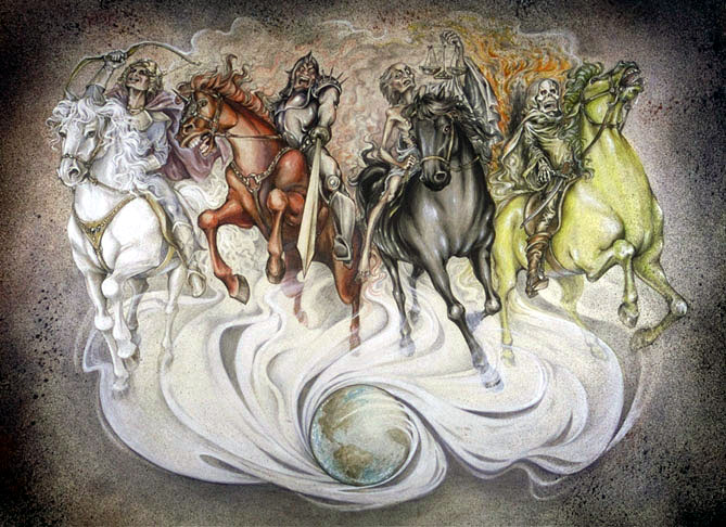 Revelation 6:1-17 "And I saw when the Lamb opened one of the seals, and I heard, as it were the noise of thunder, one of the four beasts saying, Come and see. And I saw, and behold a white horse: and he that sat on him had a bow; and a crown was given unto him: and he went forth conquering, and to conquer. And when he had opened the second seal, I heard the second beast say, Come and see. And there went out another horse that was red: and power was given to him that sat thereon to take peace from the earth, and that they should kill one another: and there was given unto him a great sword. And when he had opened the third seal, I heard the third beast say, Come and see. And I beheld, and lo a black horse; and he that sat on him had a pair of balances in his hand. And I heard a voice in the midst of the four beasts say, A measure of wheat for a penny, and three measures of barley for a penny; and see thou hurt not the oil and the wine. And when he had opened the fourth